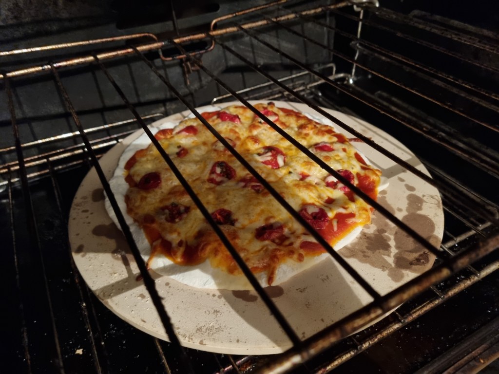 So you are ready to go, now open your oven, place your tray onto the hot stone, close the door and set your timer for 8 minutes, if your oven only goes to 250c like mine. If you can get the temperature higher, then set your timer to a lower setting.
