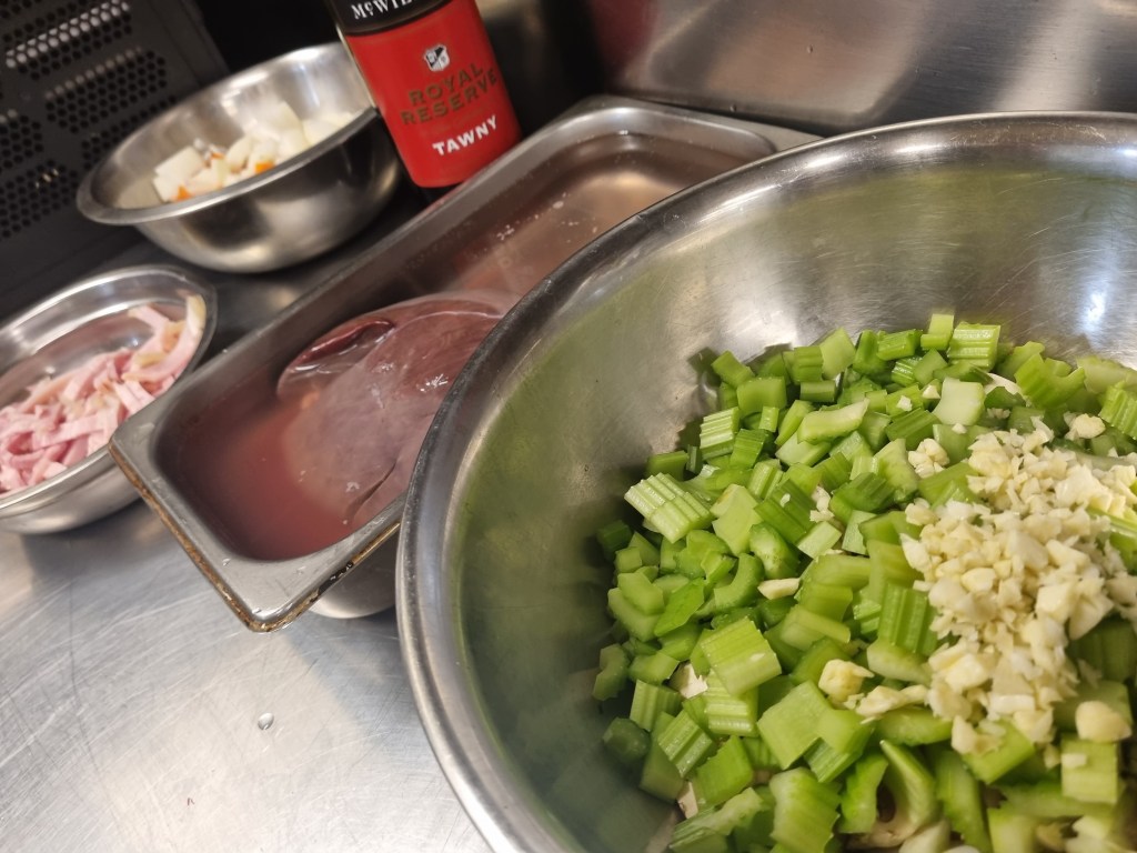 While your waiting for your lambs membrane to loosen up for easy removal, peel and dice your onion, clean and dice your celery, chop your mushrooms and take the top and tail of your carrots, slice them whole vertically, then do the same with your halves, then dice to required size. You are looking for roughly a 1cm square cut for all vegetable, while be aware that these ingredients will shrink by roughly one third once cooked if you feel like changing it up. Finely chop your garlic, slice your bacon into strips, then chop your thyme up also.
