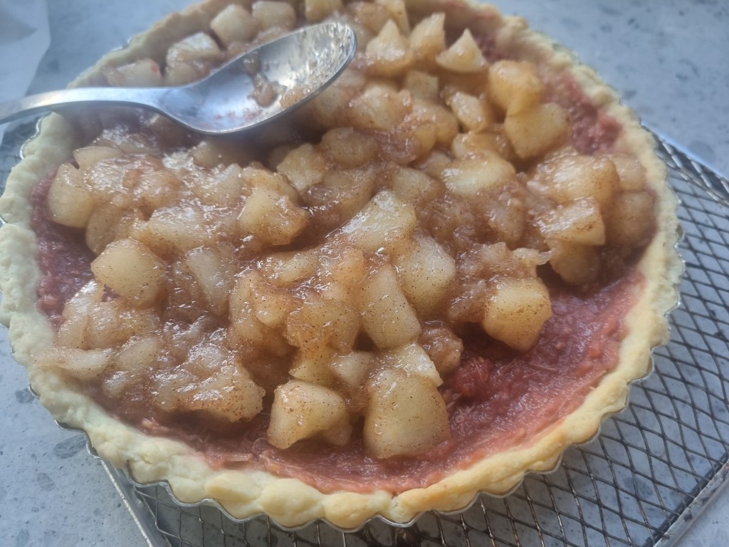 Smear your rhubarb compote as evenly as you like across the bottom of your tart case, then do the same with your braised apples.