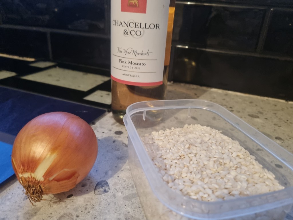 Sauté the onion, without colouring it, until translucent, then add the garlic, thyme and rice. At this point you’re looking to sauté the rice enough so that it becomes partially translucent, but you don’t want to colour anything either. Once you think the rice has cooked/warmed enough to become translucent, apply 3/4 of the wine stock.