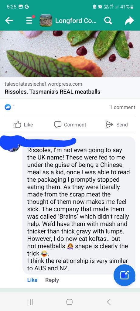 Surprisingly, people in my hometown gave rissoles a big thumbs up, as you will see from the screenshot below. According to Launceston chit chat anyways. Launceston chit-chat is a 18,000 member online forum for people based in and around launceston. See below.