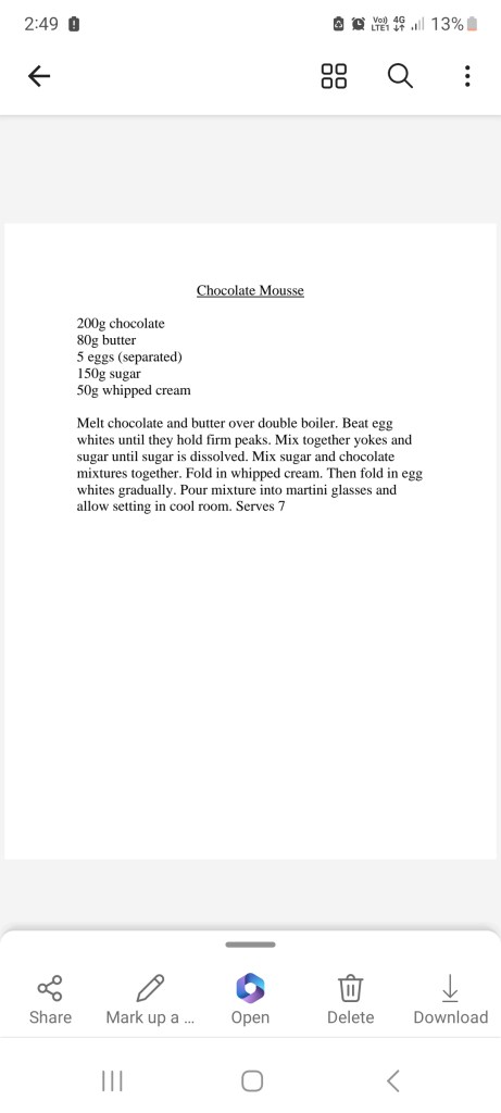 I still own a rough chocolate mousse recipe that a pastry chef threw at me one day when I was a third year apprentice. The mousse is average at best, and it refuses to hold its buoyancy if followed with any other chocolate.
