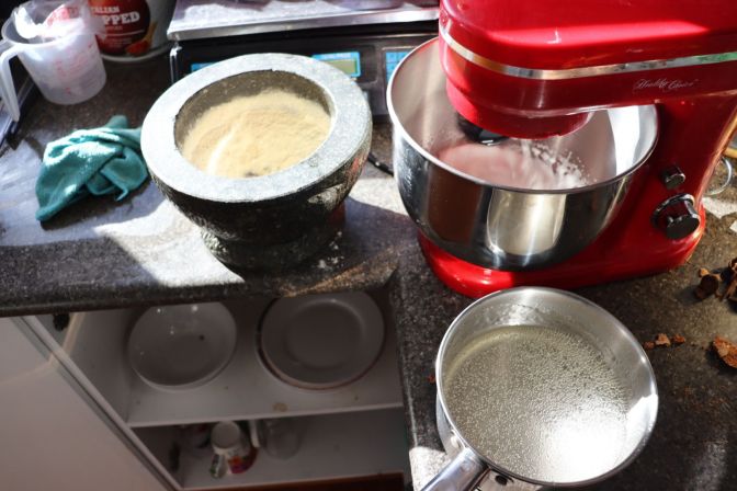Take your cacao butter and melt it in the microwave. Melt it down in small hits, stirring after 15-20 second intervals. Cacao butter is hard as a rock, and it will want to carbonate if you don’t help it break up.
