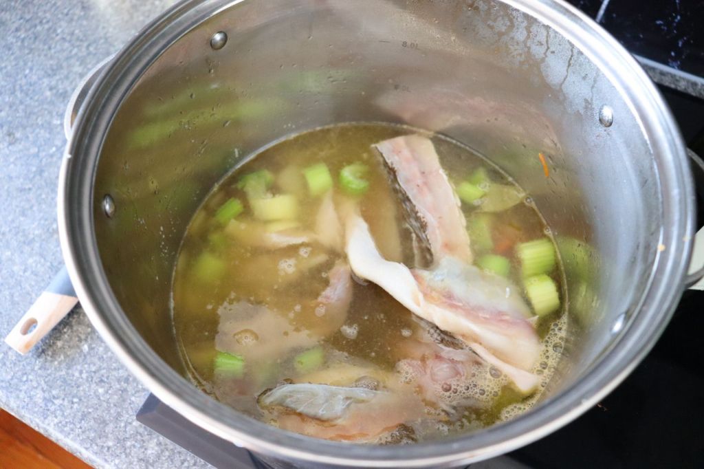 Add your white wine, fish bones, and water.