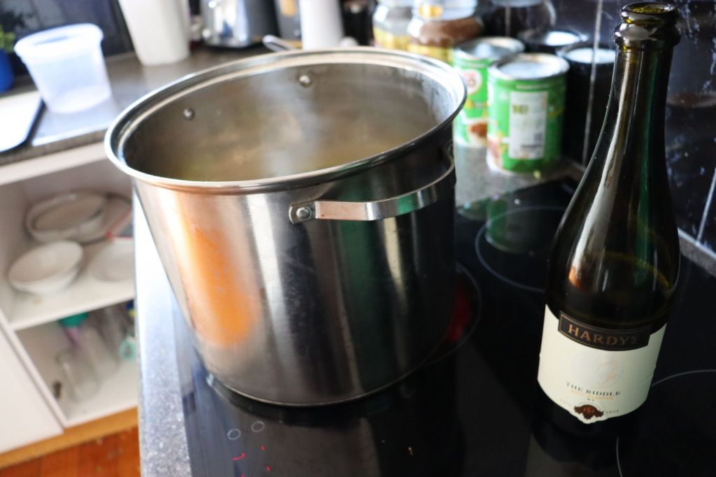 Bring the pot up to a boil, add the bay leaves, herbs, and pepper corns, then turn down to a simmer and simmer for 25 minutes.