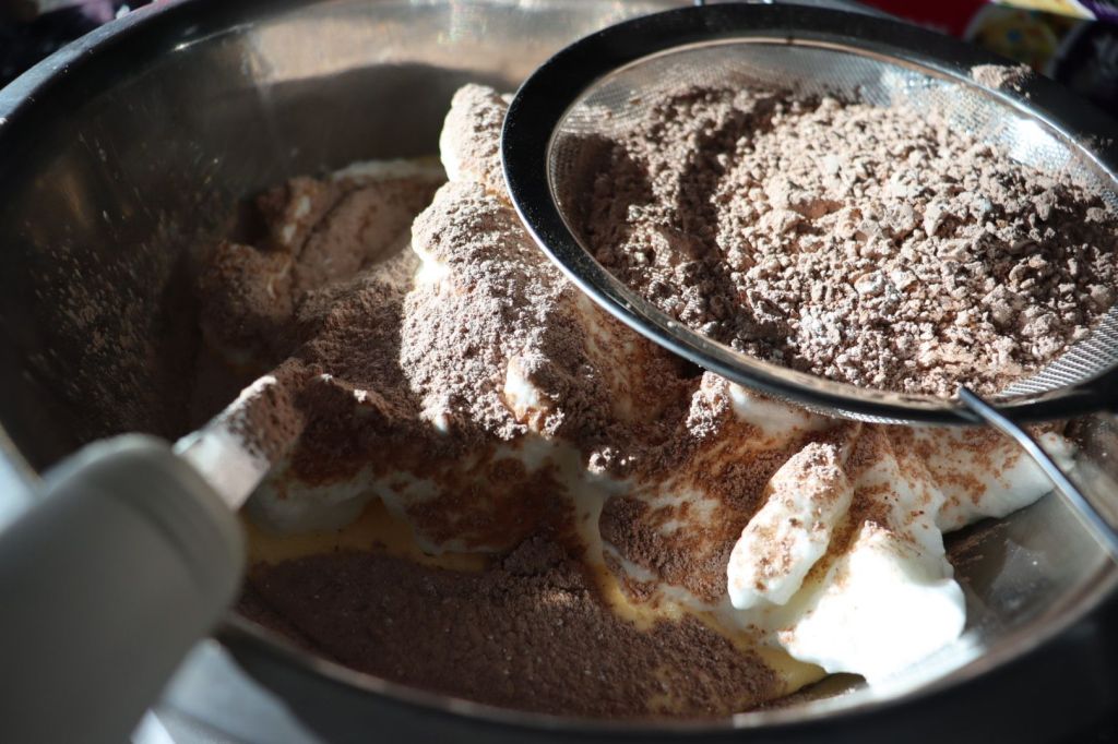 Once the first addition is incorporated into your sabayon, add the rest of your dry ingredients, and whites, then mix them through.
