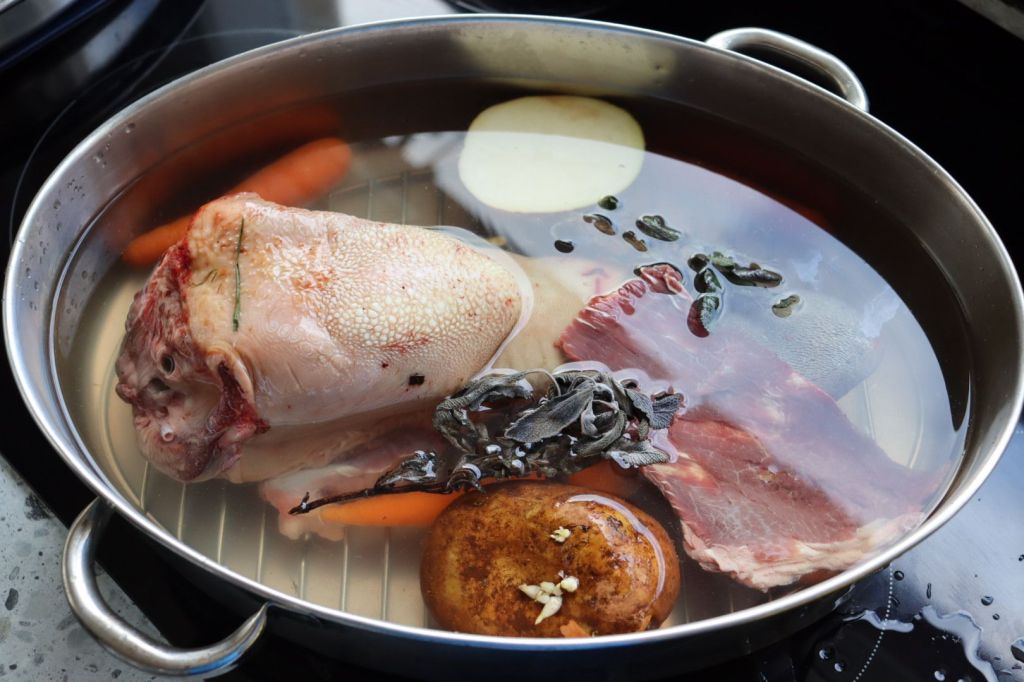 The following day, remove the tongue from the stock, wash away brine, and then peel away skin.