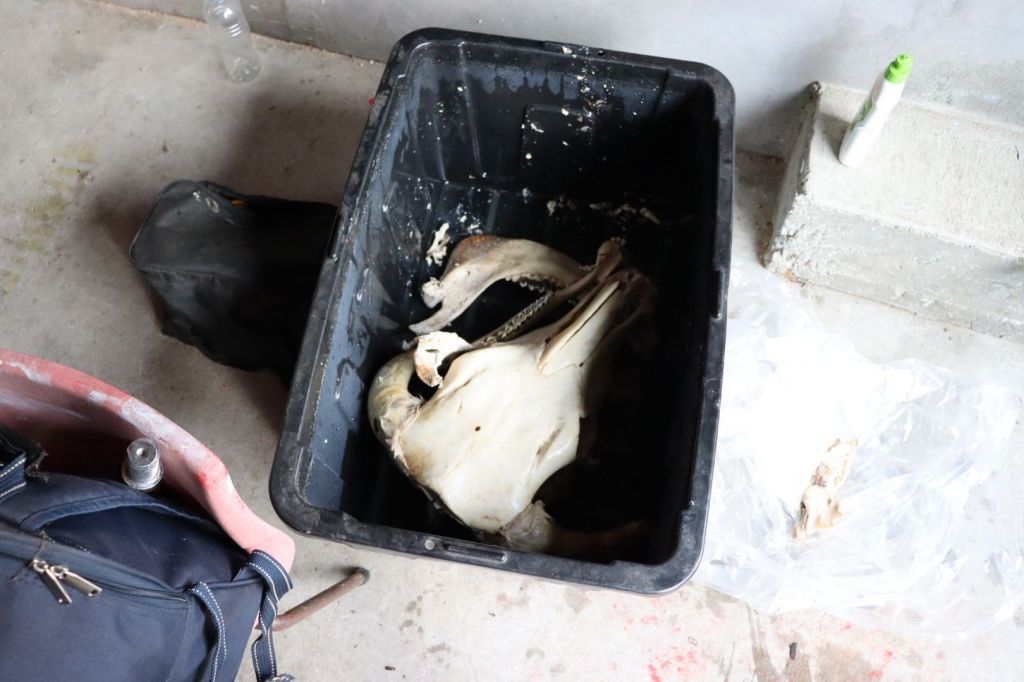 I grabbed the hose, placed the noozle in the skull hole, and let it flow for a good 5 minutes. Washing out all the brain matter.